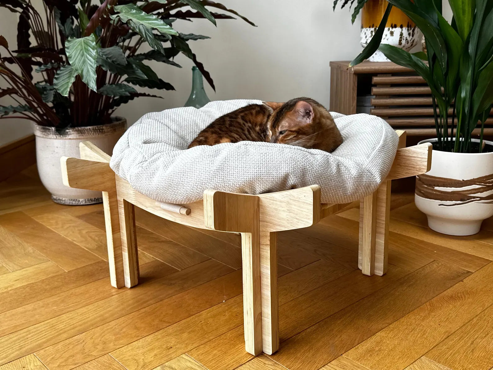 A stylish solid wood cat bed built to last. Includes a soft, extra-thick cushion for maximum comfort. A beautiful, premium design that blends perfectly with modern home décor.